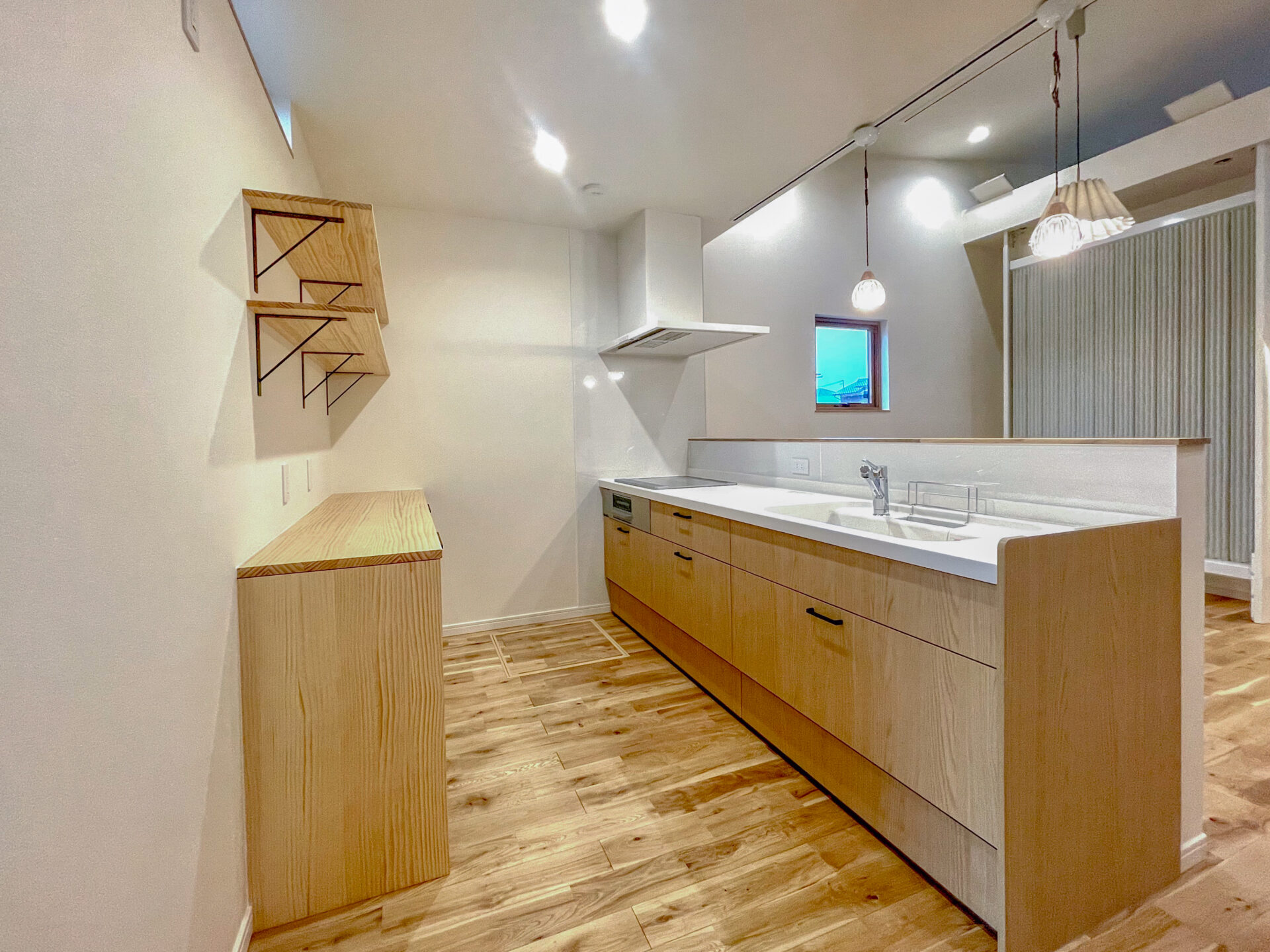 今回のお家は二世帯住宅だから「平屋のリビングキッチン」と「二階建てのリビングキッチン」が両方ございます。