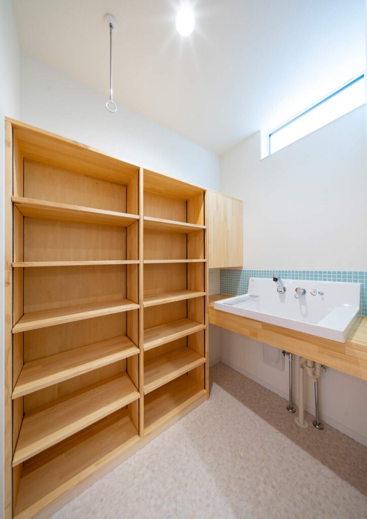 家づくりでこだわったのは、洗面台の横に設けた“可動棚収納”。